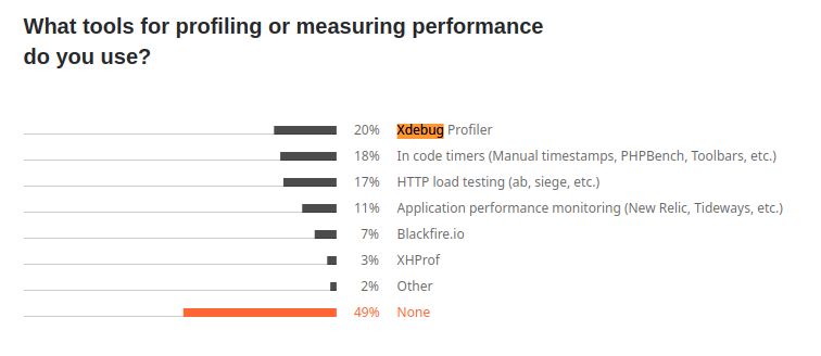 We can learn from the insightful survey from JetBrains released in 2021 that Xdebug is the most popular tool with 20% of usage among all the other tools to perform code profiling or performance measuring (which also include tools like APM or HTTP load bench). Blackfire reaches a solid 7% of usage. The survey highlights that there is also plenty of developers - 18% - who collect their performance metrics right from the code, by setting manual timestamps for instance. It can obviously be an effective solution if you just need to profile a known-beforehand part of your code.